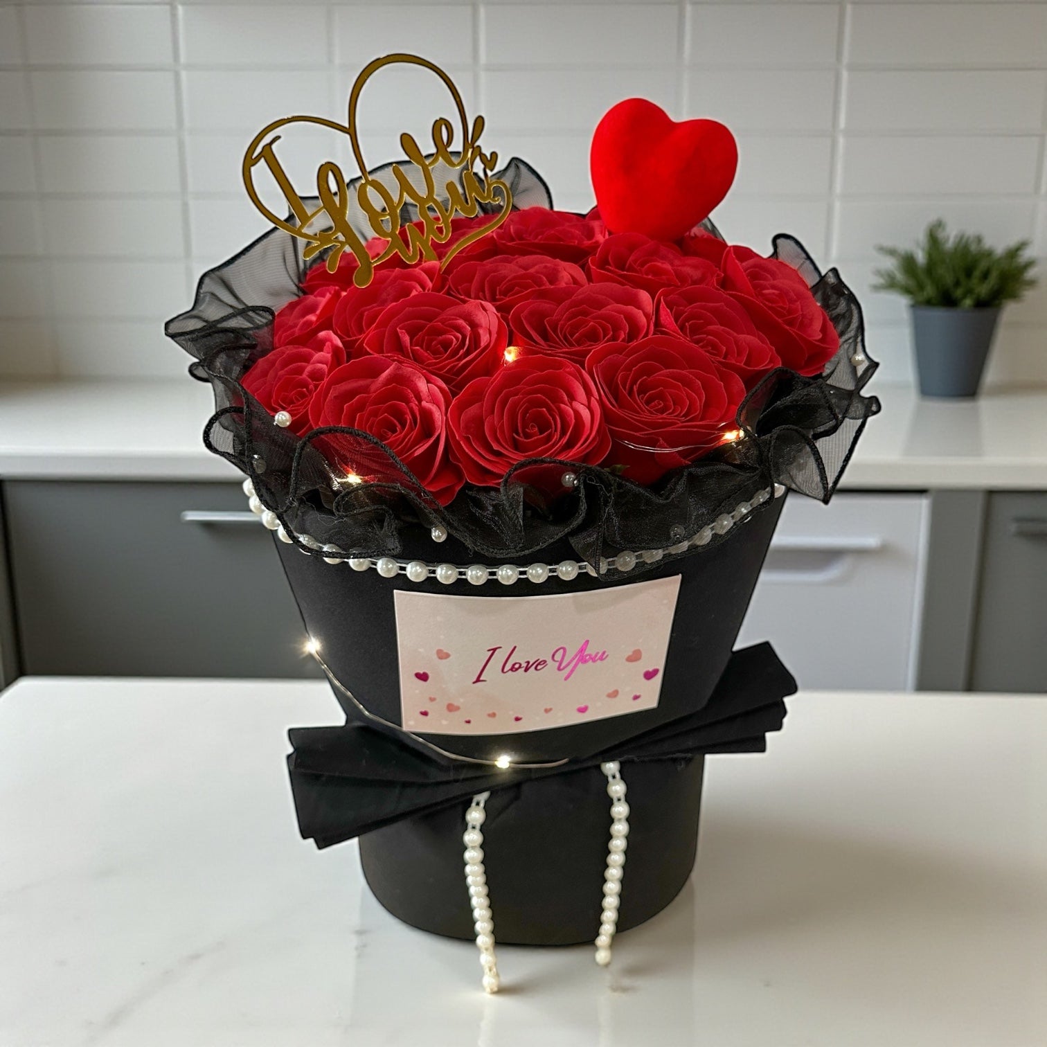 Bouquet of red roses in a black container with decorative elements on a kitchen counter.