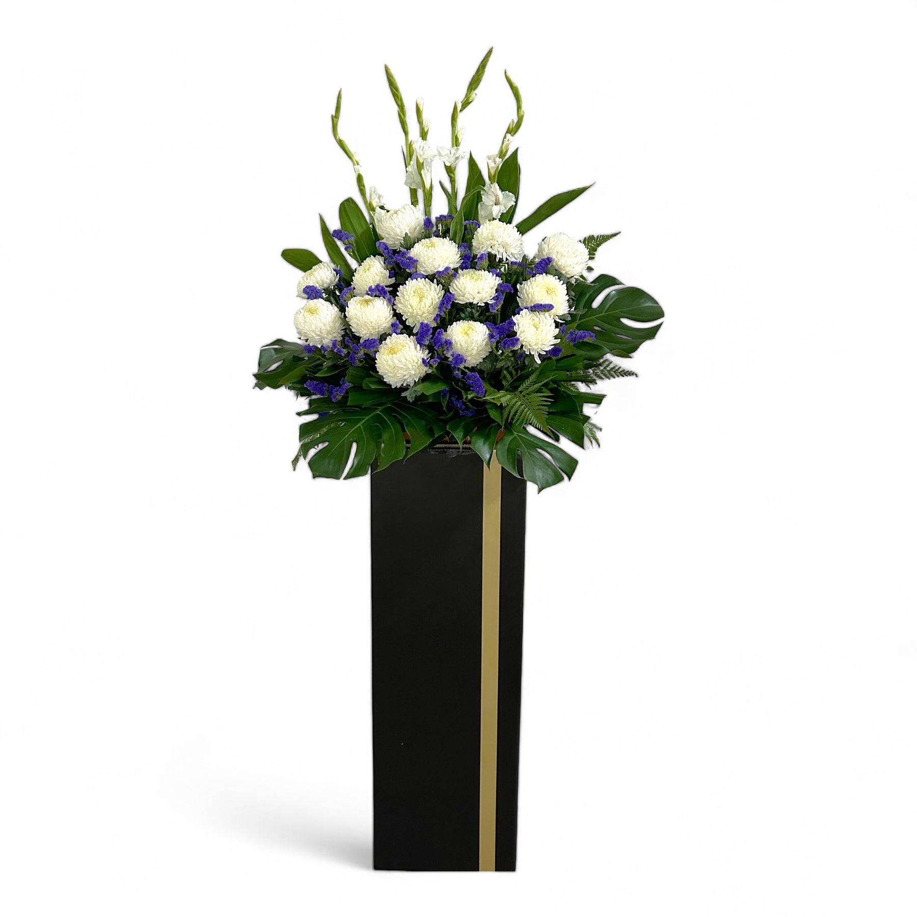 Do not languish at the absence but celebrate the life of an inspiring loved one or friend. There is tranquility to be found reminiscing in happy memories. Let this ensemble of gladiolus, chrysanthemums and statice be a token of remembrance and lend a fighting spirit to tide through this period.