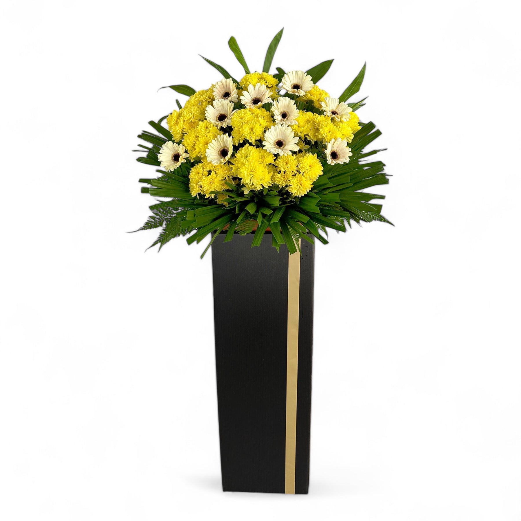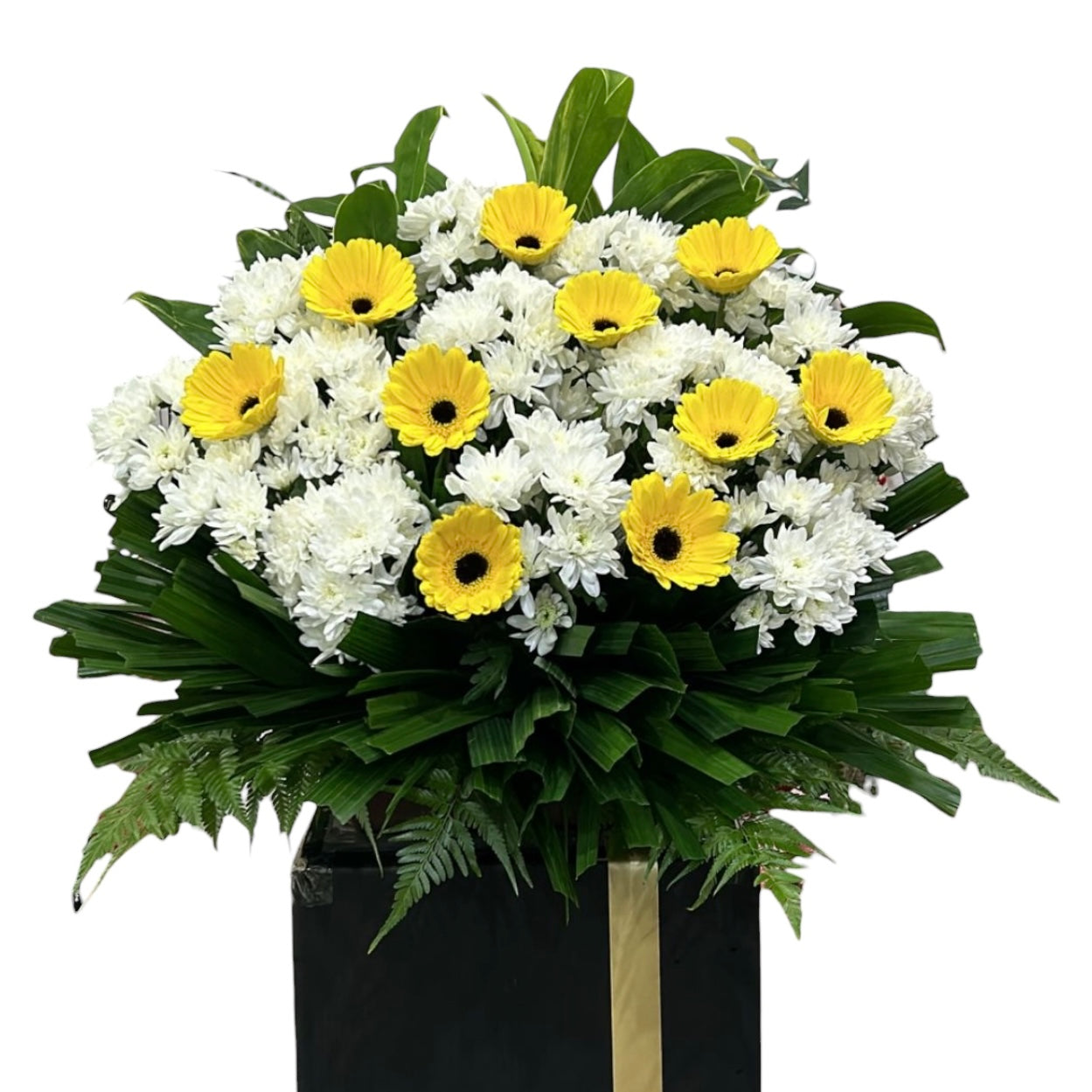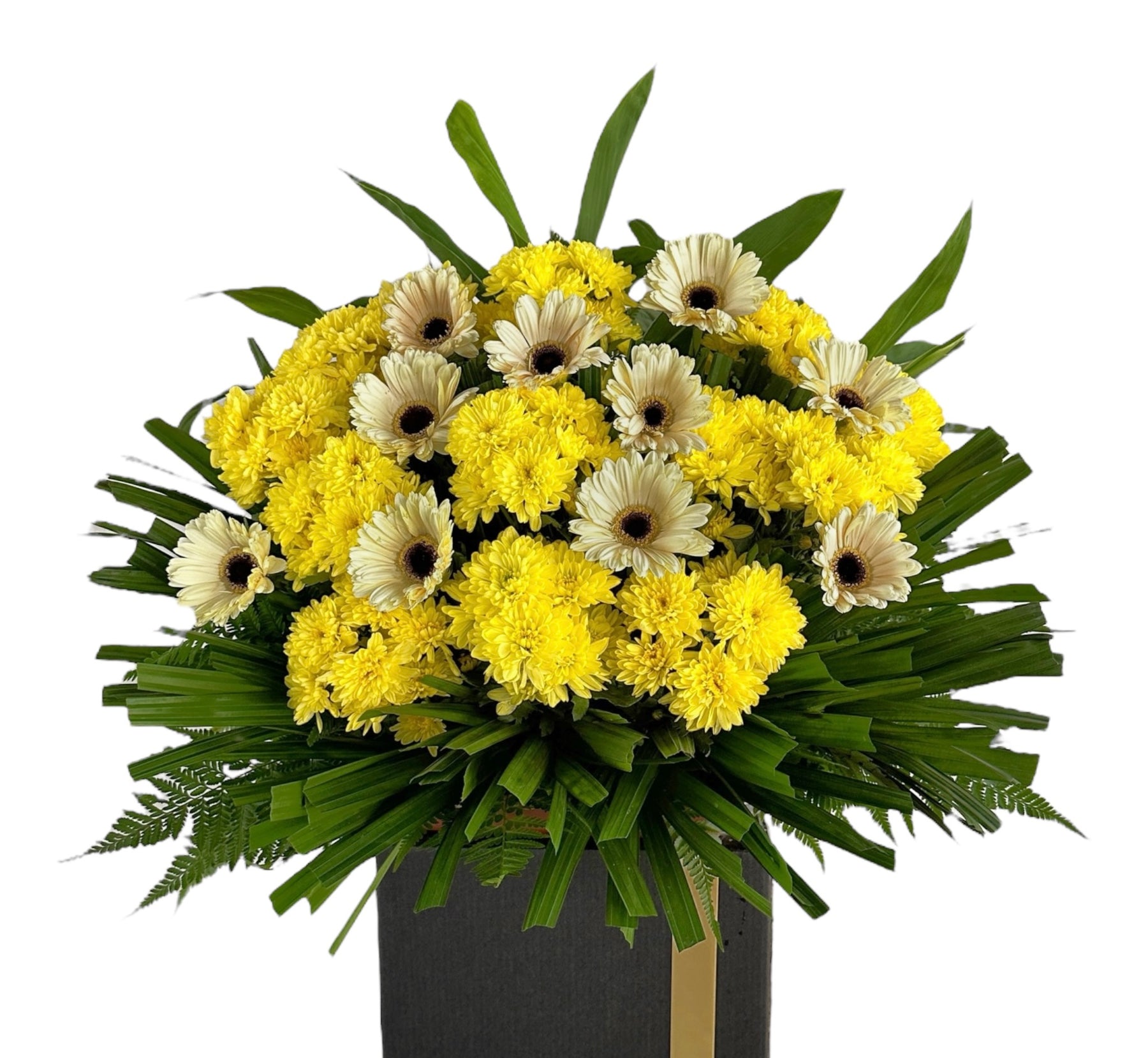 Send your unspoken thoughts to the bereaved with white gerberas and mini yellow chrysanthemums as the last goodbye. They have had a good run with you and now it’s time for them to be laid to rest; be one with their family and show your support through this trying period. This arrangement consists of