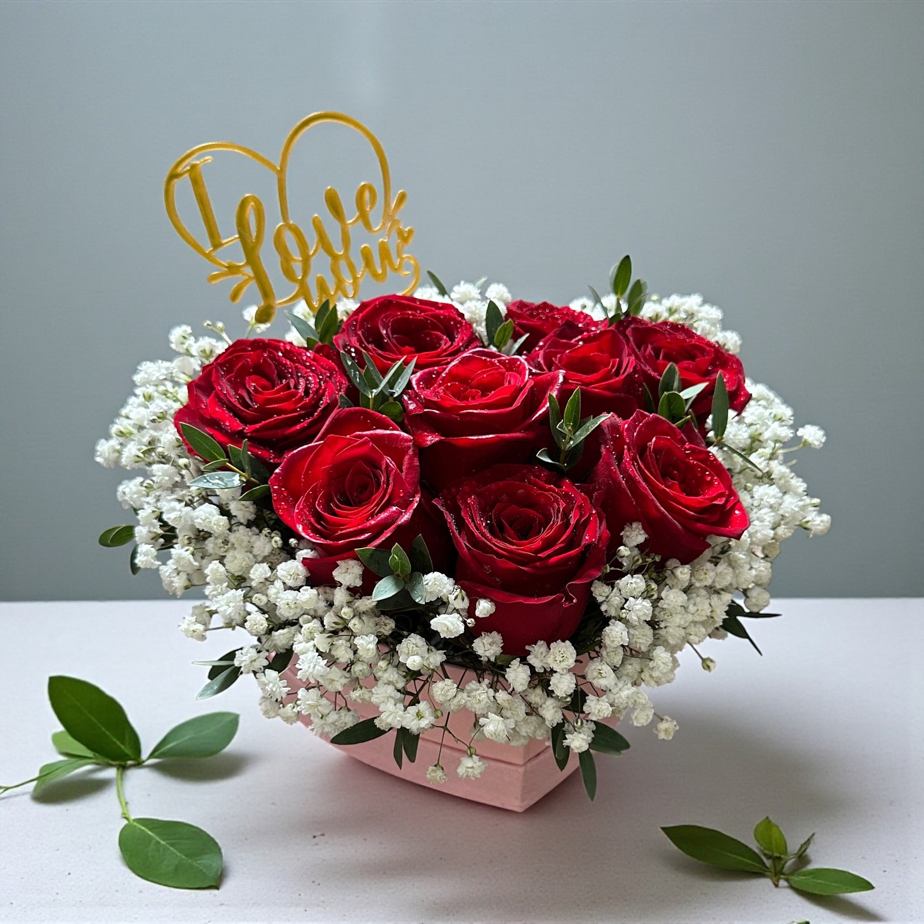 Love takes shape in this adorable heart-shaped arrangement! Lush red roses steal the spotlight, while delicate baby's breath and fresh eucalyptus add the perfect finishing touches. But here's the cherry on top – an "I Love You" tag that puts your feelings into words. Whether you're planning ahead for Valentine's Day or surprising someone just because, Beloved is your wingwoman for romance. It's flirty, it's sweet, and it absolutely screams "you're the one!"