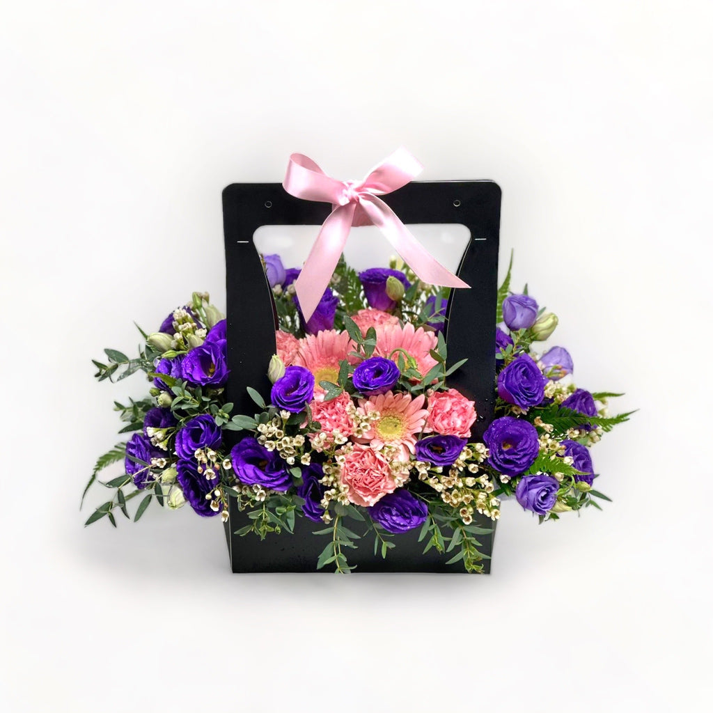 florabasket-pink-gerberas-purple-eustomas-and-pink-carnations-black-basket-ribbon-with-white-background